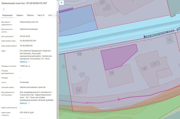 Лот №2.Продажа земельного участка из земель населенных пунктов, имеющего кадастровый номер 10:18:0050115:187, площадью 1 860 кв. м, местоположение: Российская Федерация, Карелия Республика, Лоухский муниципальный район, Чупинское городское поселение, пгт. Чупа, вид разрешенного использования – «Для индивидуального жилищного строительства. Территориальная зона - Ж-1. Зона застройки индивидуальными жилыми домами».
